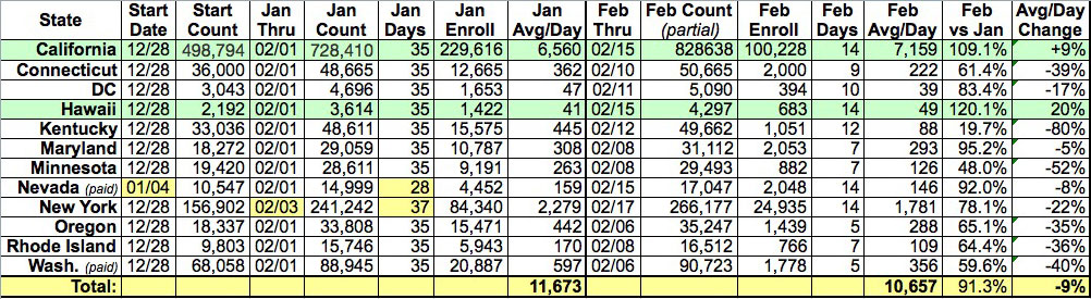 UPDATE: OK, since the California press release also finally includes a "paid/unpaid" breakdown (80%), I've re-run the spreadsheet dropping all of the CA numbers down by 20% to only include paid enrollments. The CA avg. per day stays at a 9% increase over January, but the impact on the overall numbers is lessened a bit, so we're now looking at roughly an 11% drop instead of 9%. This suggests more like 820,000 February enrollments instead of 840,000, but the overall point is pretty much the same: