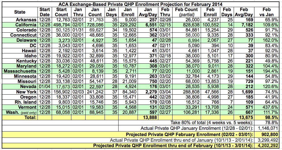 - If accurate, this would bring the cumulative total of exchange-based private QHP enrollments to 4.202 million (from 10/1/13 - 3/01/14)