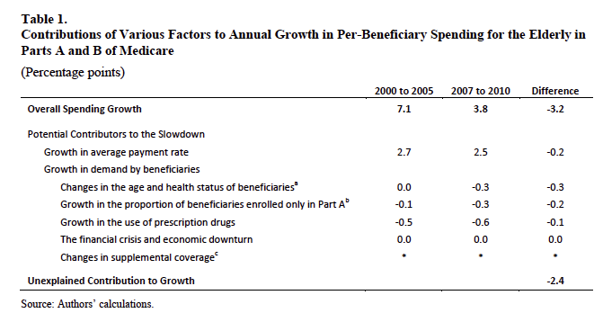 The problem is that no one has come up with a research-grounded explanation of why per capita Medicare cost growth has flattened. What's worse, almost all of the solid research has focused on the private insurance market, not Medicare or Medicaid, and the generally accepted expert point of view is that most of the slowdown is recession-driven, and cost growth will return (after a lag time) as economic growth picks up (see here). The CBO did a terrific Working Paper in August, 2013, that looked squarely at Medicare, concluded that the recession had nothing to do with the slowdown, and then said that most of the slowdown could not be explained and more research was needed. Here's the key chart: