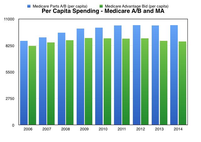 The above tells me that MA delivered all Part A and Part B care in 2014 for an average bid of $8,671 per beneficiary, 16% below the $10,339 average for FFS Medicare; and even adding the $799 MA rebate back in, gives only a $9,470 total, still 8% below Medicare. Per beneficiary MA costs have been gradually declining since 2009, opening up the gap with FFS Medicare - MA 9.5% lower in 2009; now 16% lower.
