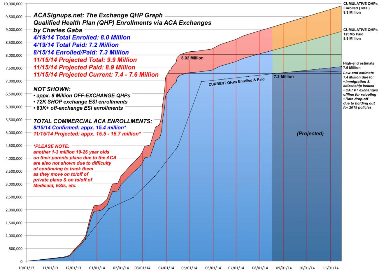 UPDATE x2: I should also clarify that the 7.6M as of 11/15 is a high-end estimate. That number assumes 9K/day being added every day right up through 11/14, which probably isn't likely; there will almost certainly be a significant drop-off in the final few weeks, since anyone not in immediate need of coverage will be very likely to just stick it out for another couple of weeks until the 2015 open enrollment period starts up again on 11/15, with new policies, new premiums and so forth to choose from.