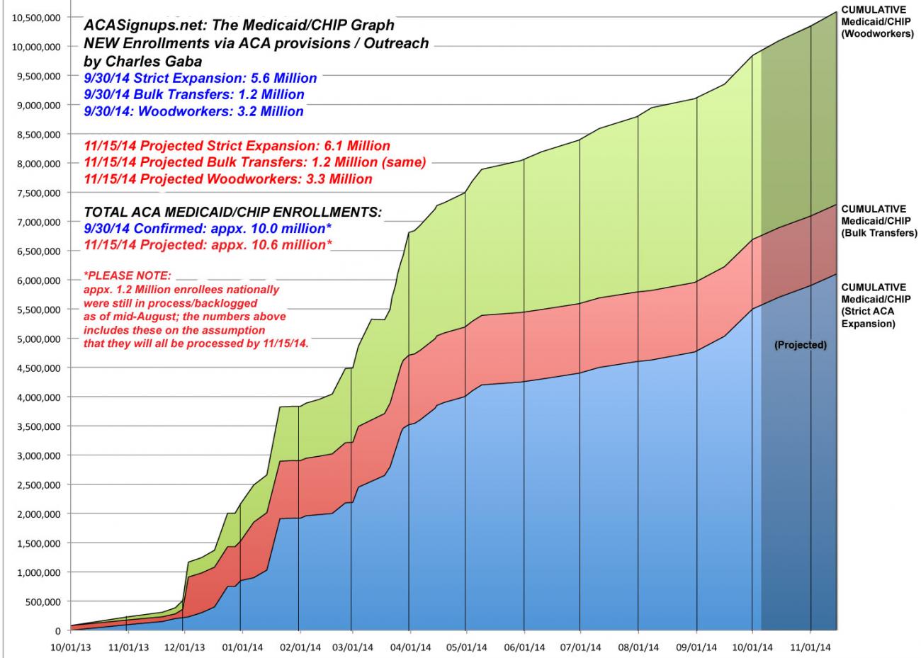 There's two important points to keep in mind, however: First, again, that only ran through 6/30/14; there's been 3 solid months of additional Medicaid/CHIP enrollments since that time; and second, as of September there was a backlog of over a million people still waiting to be processed and added to the Medicaid/CHIP roles (1/3 of this in California alone).
