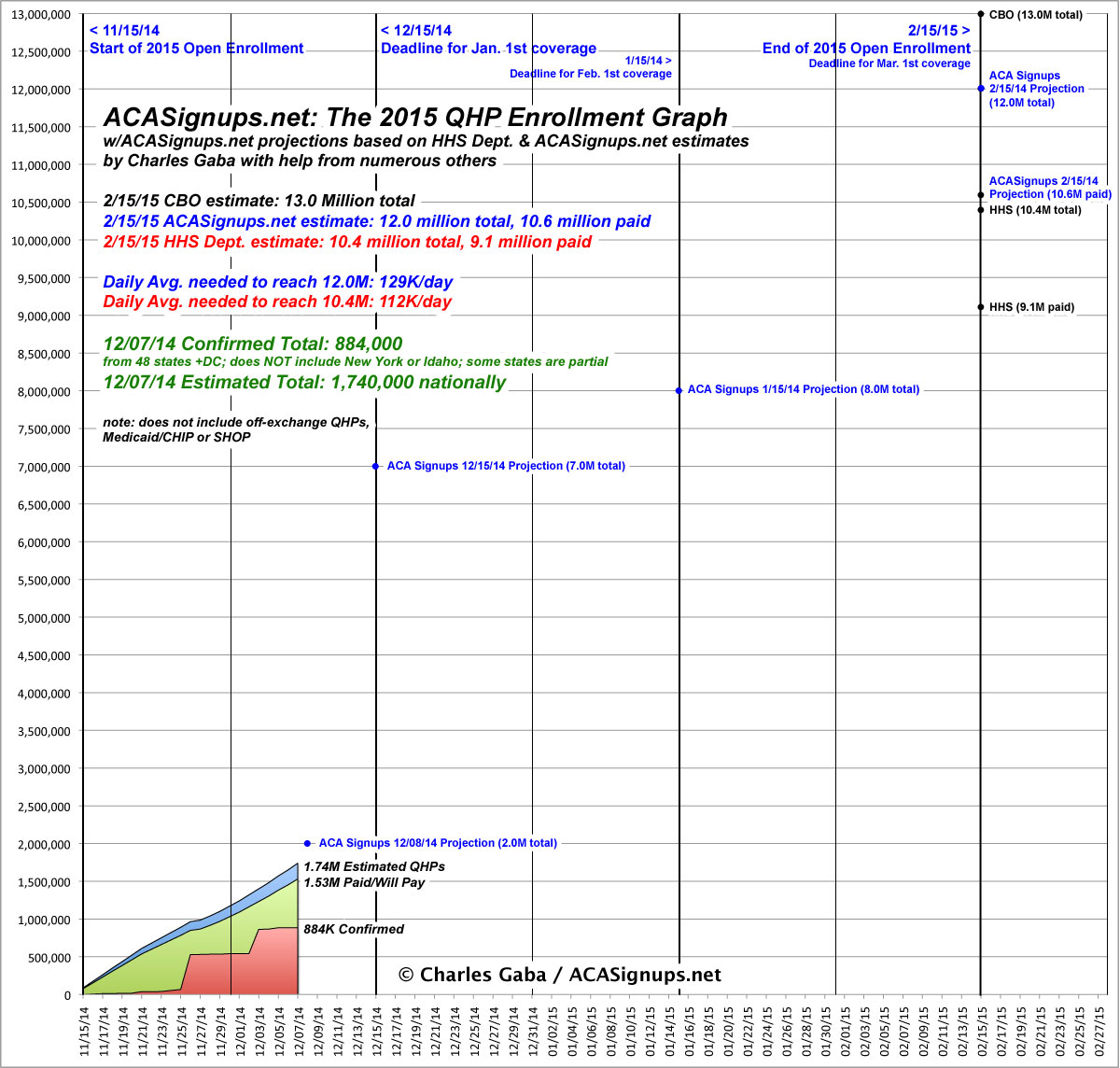 As of last night (Sunday the 7th), the totals should be roughly 1.74 million nationally (1.30 million HC.gov). Until now, enrollments nationally should have been averaging roughly 75-80K/day (except for a lull on Thanksgiving, of course).