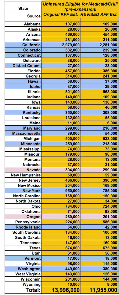 KFF.org updates est. of total uninsured eligible for Medicaid (appx. 2M less than previously thought)