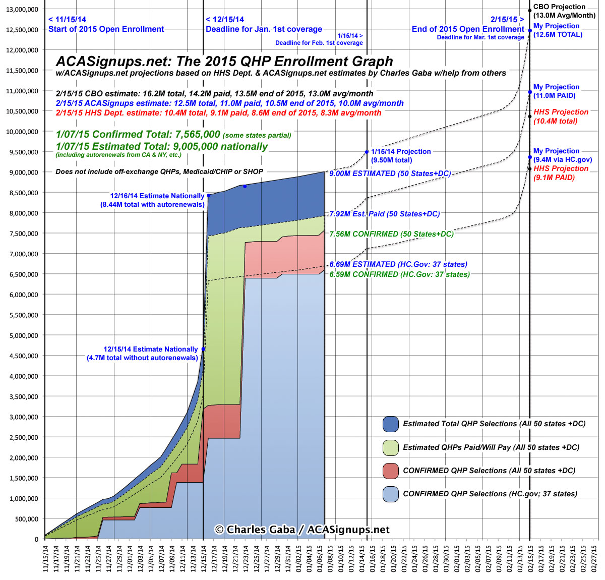 As always, this is just an estimate; it could be slightly higher or lower. However, my best estimate is that 2015 private QHP selections via the various ACA exchanges (HC.gov plus the 14 state-based versions) will cross the 9 million milestone sometime today if it hasn't already done so.