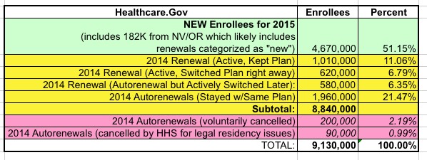 Out of those, about 200,000 were auto-renewed but didn't want to be, so they cancelled their policies. Another 90K were dropped whether they liked it or not due to legal residency verification issues. That left around 4.17 million who either kept the plan they were auto-renewed to or switched to a different one after initially being renewed to the same policy. Another 4.67 million new people joined in, although Nevada and Oregon enrollees were counted as "new" even if they were actually 2014 enrollees who had to manually start from scratch again.