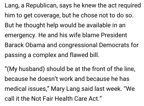 - Pollack then tries to explain to Lang that without the ACA, he'd have been completely uninsurable regardless of any enrollment deadlines, because of his pre-existing conditions (smoking, diabetes, etc). Lang's response is...well, frankly, to ignore the question and blame everything on "the politicians" of both parties. He also claims that he was jussssst about to enroll in insurance after all (I guess his "pride" finally ran out?) when gosh, whaddya know, his medical problems beat him to the punch.