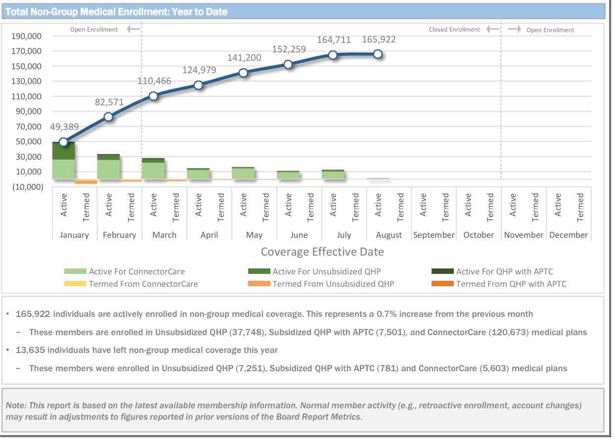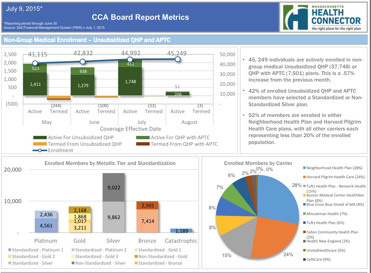 But wait, there's more! Look below and you'll see a whole mess of pie charts, bar charts and line charts, breaking out everything from Metal Level selections and Market Share by Provider to SHOP enrollments (5,247 lives covered as of July 1st) and even Dental Plans!