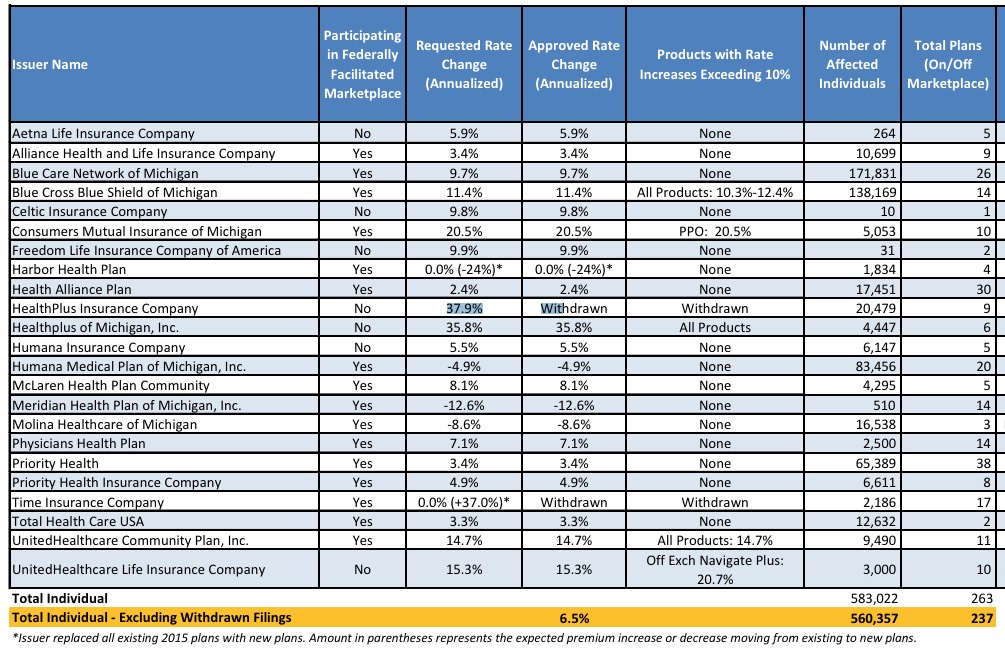 Michigan: *Approved* 2016 weighted avg. rate increase: 6.5% (just 1% for Sm. Group)