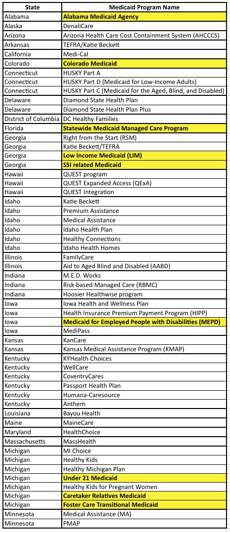 With that in mind, I decided to compile a handy list of each state and what their implementation of the Medicaid program is called. I assumed that there would be some government website I could link to which had them all in a nice, easy-to-read table, but was surprised (or perhaps not so much) to discover that there doesn't appear to be one.