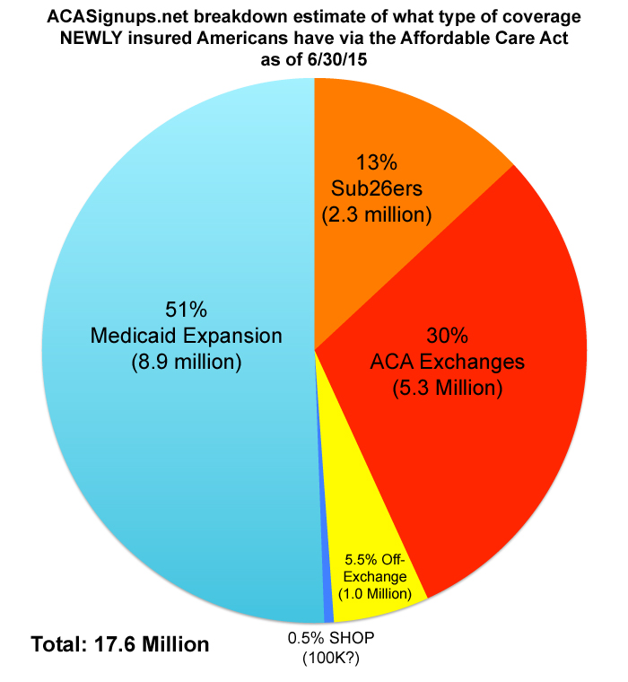 - As I've noted repeatedly, the ACA's Small Business Health Options Program (SHOP, though it should really be SBHOP which sounds stupid) has been a bit of a dud; only about 80,000 people enrolled in 2014 (when only a handful of SHOP exchanges were even working), and only around 200,000 people are enrolled via SHOP policies this year even with all 51 running full steam. I have no idea how many of these people are newly insured, but let's split the difference and call it 100K. It's a small enough number not to matter much either way.