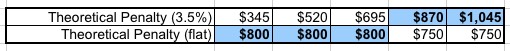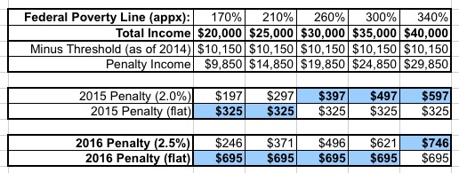 As you can see, for 2015, the "flat" penalty was $325 even at $20K and $25K, but went up substantially after that. However, 2015's penalty will be what it will be at this point; what I want to know is the 2016 situation...and here, it's the flat $695 which these folks will have to pay for 4 of the 5 income levels. It's not until you get up to $40K that the 2.5% rate takes over.
