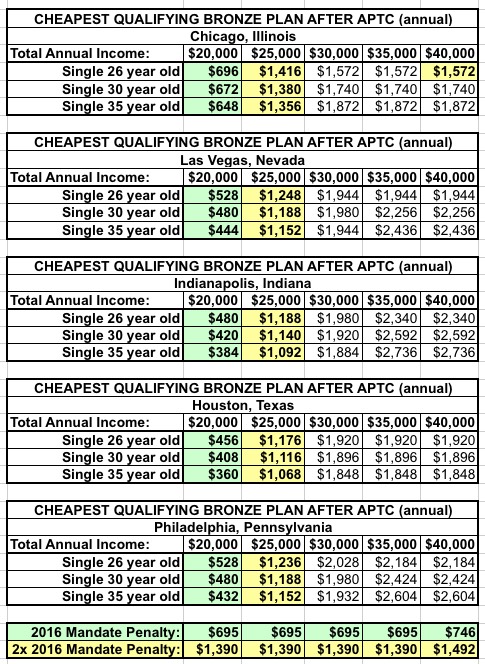 However, in this case I'm instead looking at people who simply want to scratch the "health insurance" issue off their "to do" list in the least-expensive way possible. That basically amounts to checking the tax penalty against the dirt-cheapest plan needed to avoid the penalty (which generally means a Bronze plan or, in the case of the 26-year olds, possibly a Catastrophic plan). Basically, the mindset here is "What's the bare minimum I need to sign up for to get the government off my ass next spring?"