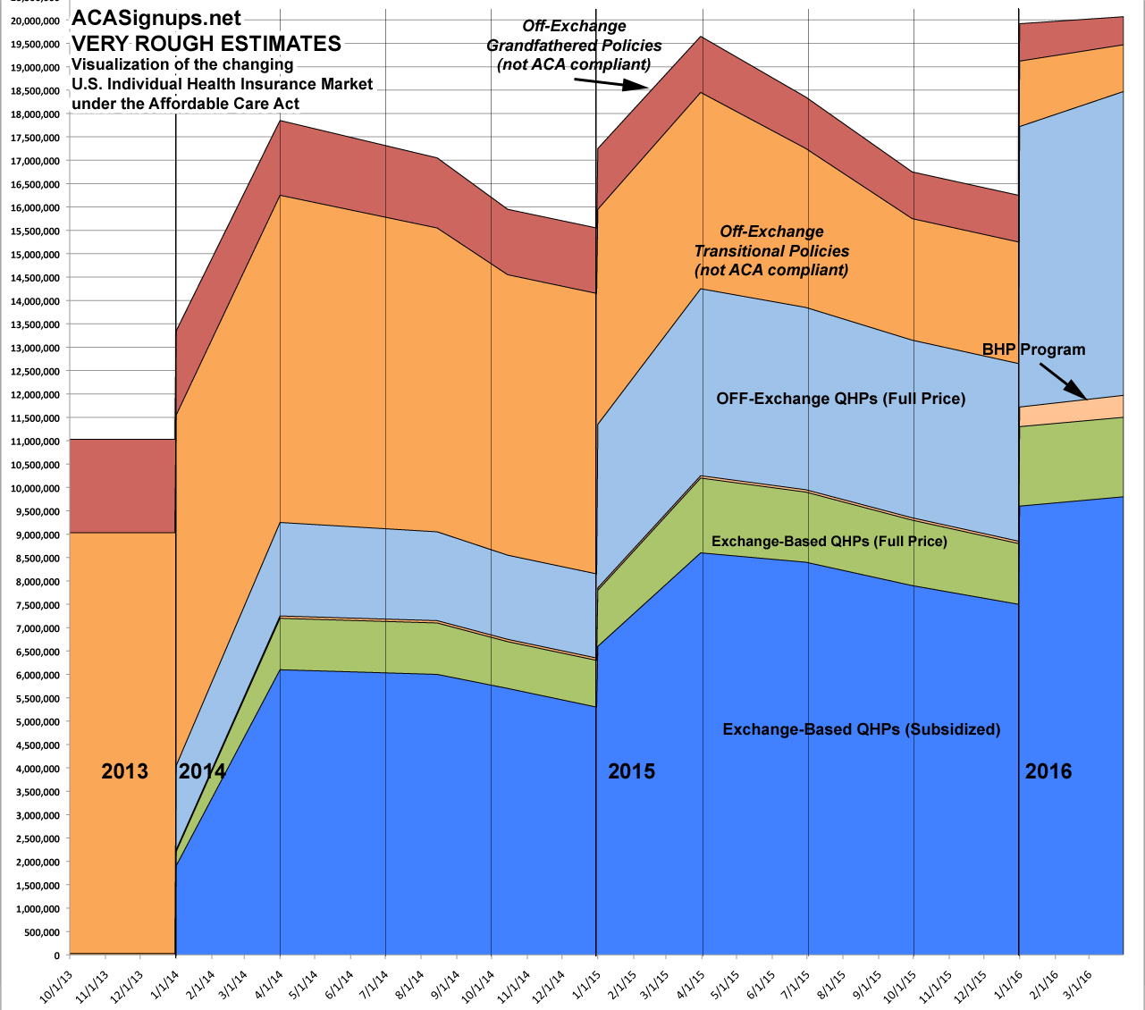For the exchange-based columns, I used hard numbers based on the number of paid QHP enrollments as of the listed dates, which are generally about 10-12% lower than the total number of policies selected. These numbers drift downwards somewhat as the year progresses due to attrition as people drop off their policies, as well as getting kicked off for non-payment or legal residency verification issues, before shooting back up again in the early part of the following year. The same thing happens to a lesser extent for the ACA-compliant off-exchange policies.