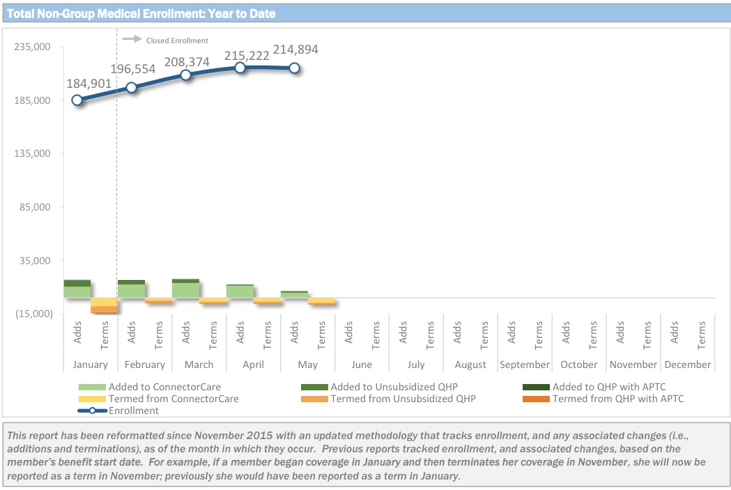 As I've noted the past few months, unlike most states, the Massachusetts Health Connector has not only seen no net attrition since the end of Open Enrollment, but has actually seen a net increase in enrollment...mainly due to their unique "ConnectorCare" policies, which are fullly Qualified Health Plans (QHPs) but have additional financial assistance for those who qualify and which are available year-round instead of being limited to the open enrollment period.