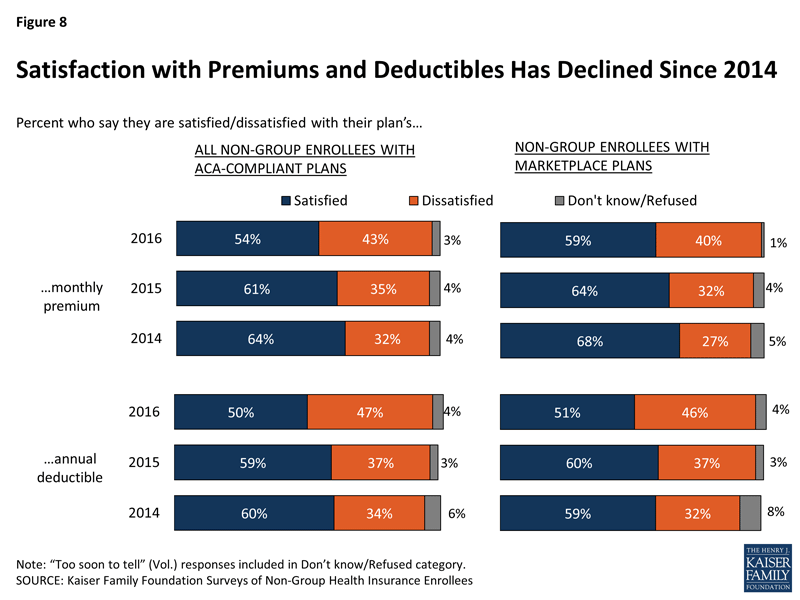Among those with Marketplace coverage, most say that when they were shopping for their current plan, it was easy to compare premiums, cost-sharing, and provider networks, and to find a policy to meet their needs. While most measures of the shopping experience are similar to 2015, among those with Marketplace plans, the share saying it was difficult to set up an account with the marketplace decreased from 34 percent in 2014 to 25 percent this year.