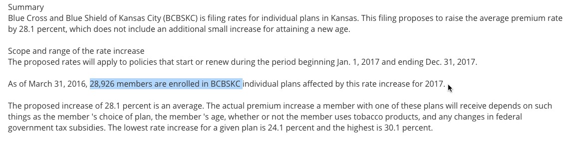 The good news about Kansas is that 5 of the 6 carriers which have submitted 2017 individual market rate filings included their current enrollment totals in a clear, easy to see format...and the 6th one is (once again) "Freedom Life" which, judging by the dozen other states they've popped up in, almost certainly has only 1 or 2 enrollees (or none at all) anyway.