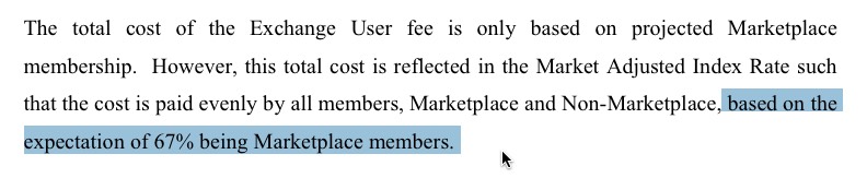 Most of the other carrier data is taken straight from their 2017 filings. The major exception is the big one: BCBSTN, which holds a commanding 68.91% of Tennessee's exchange-based enrollment, is asking for a whopping 62% average rate hike next year (ouch). Unfortunately, their filing (see below) doesn't list the number of covered lives who'd be impacted by this increase, but another part of the filing does state that they're assuming that roughly 67% of impacted members will be exchange-based. Using the same estimates as above, that means BCBS has about 161,000 exchange-based enrollees...and if that's 2/3 of their total, that means around 241,000 total.