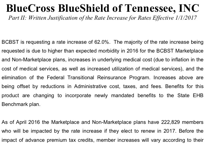 Put 'em together and...ugh. 56%. Assuming the rate requests are approved at levels close to what has been requested, unsubsidized Tennessee residents are looking at pretty ugly rate hikes next year. As always, we'll see how the regulators respond.