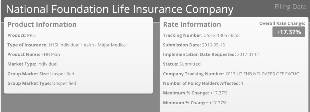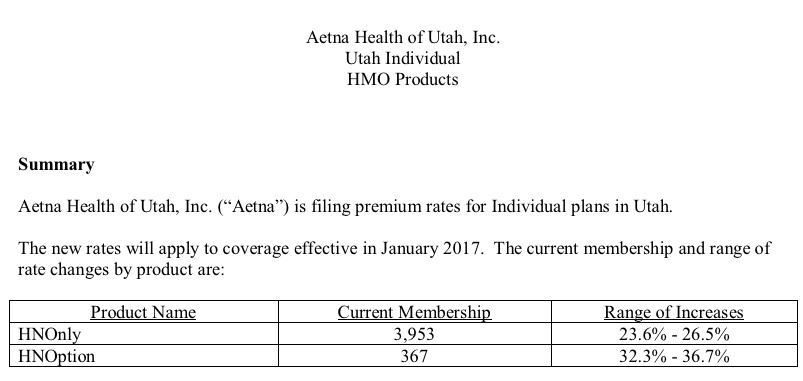 UPDATE 6/22/16: I've been informed that there was a coding glitch with Utah's website which prevented several carrier rate filings from being listed. I've gone back and plugged in the additional carriers, which account for about 32,000 more Utah residents...but which only moves the weighted average slightly, since Molina's request is fairly close to the 30% average I already had estimated.