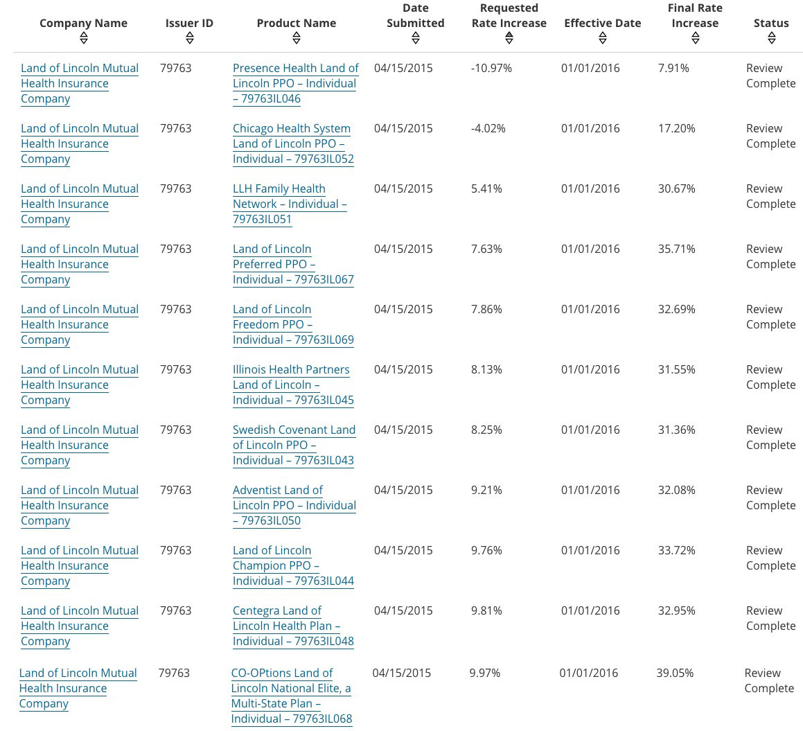 In case you're having trouble reading this, last year, Land of Lincoln requested rate changes ranging from an 11% drop to just under a 10% increase.
