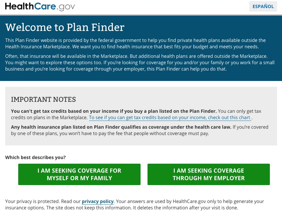 This Plan Finder website is provided by the federal government to help you find private health plans available outside the Health Insurance Marketplace. We want you to find health insurance that best fits your budget and meets your needs.