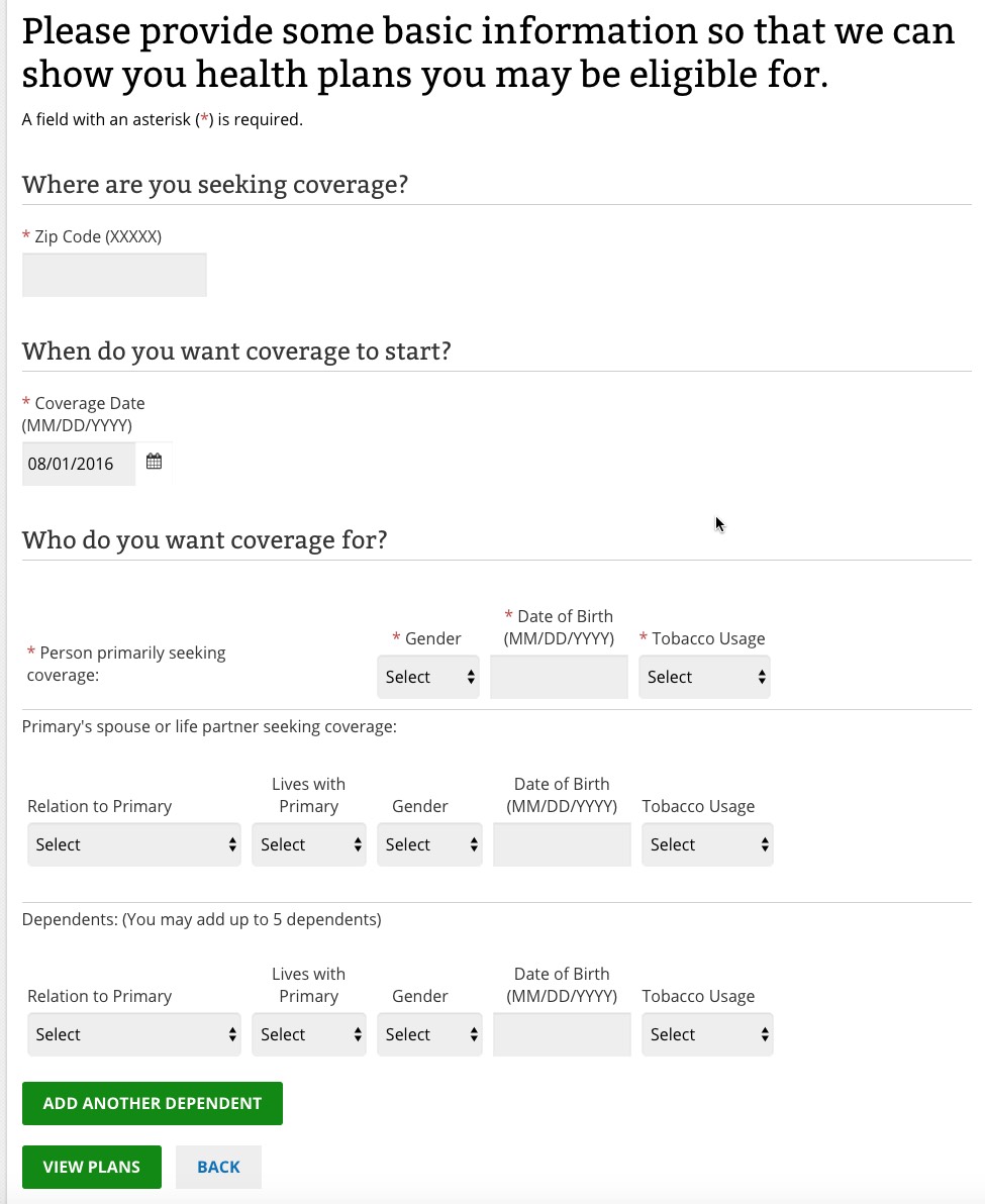 The interface itself is very similar to the normal exchange website; you plug in a few basic specs about yourself and your family and you're off and running: