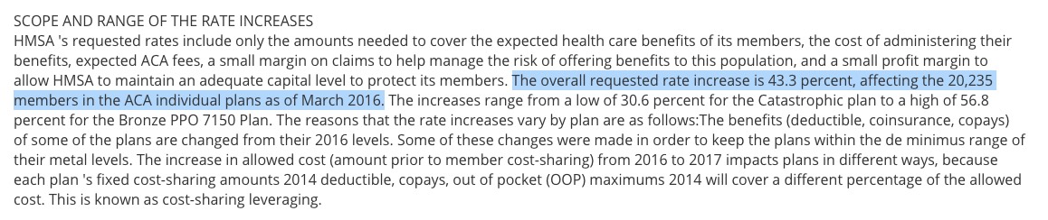 With only 2 carriers, Hawaii's table should be pretty cut and dry...but there's a huge discrepancy between what the Rate Review website claims is HMSA's "average requested increase" and what it actually says in the filings. They submitted two of them: One for HMOs, one for PPOs. According to the website, the requests average 11.85% and 13.73%...averaging perhaps 12.8% overall...