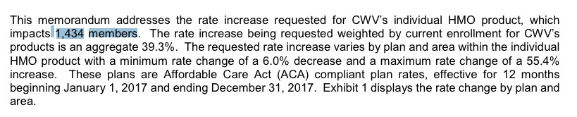 So, where are the other 40,000 or so? Beats me. West Virginia is not among the states in which UnitedHealthcare or Humana is dropping out, and while I'm sure some of them are enrolled in grandfathered (or even transitional) plans, that should only account for a tiny portion of the total. It's also conceivable that Health Plan of the Upper ohio Valley has a whopping 90%+ market share (their enrollment number isn't listed in the filings), but I doubt it.