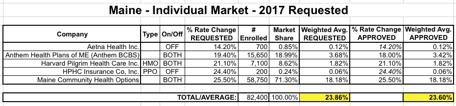 I originally estimated Maine's 2017 avg. rate hike requests back in May. At the time, I came up with a weighted average of 20.7% based on the original rate filings: