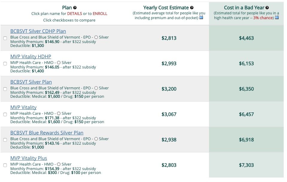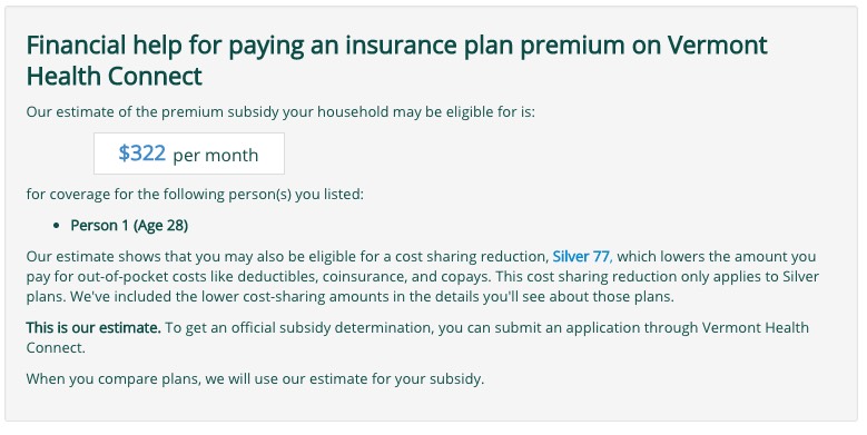 (sigh) Aside from Ms. Tyce-Royea's cringe-inducing lack of understanding about how insurance works, out of curiosity, I decided to take a look at her situation by plugging her info into the Vermont Health Connect ACA exchange website.