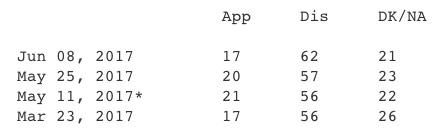 As alluded to above, note the trendline--not only is Approval of the AHCA still stuck at a pathetic 17%, check out the trendline: Disapproval of Trumpcare has increased by another 6 points since March, and now overwhelms approval by a 3.6 : 1 margin.