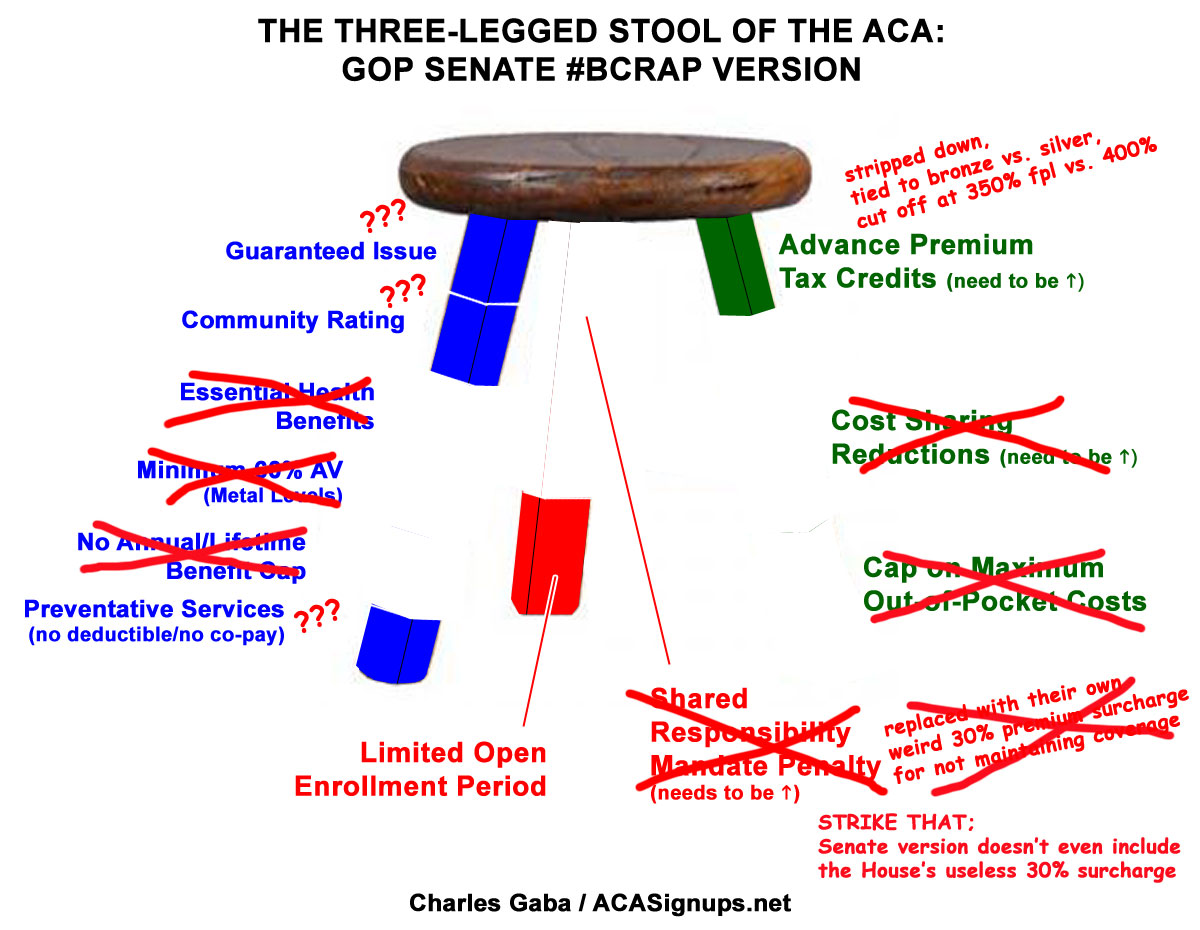 The GOP Senate version of Trumpcare attempts to balance the three-legged stool. The problem is that it tries to do this by shortening all three legs instead of lengthening the two which are too short. It basically tries to "solve" the problem by turning the Bar Stool into a Step Stool.