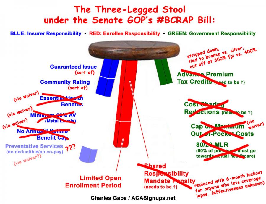 The other day it looked like the GOP Senate's BCRAP bill was going to take a hatchet to all 3 legs of the ACA's "three-legged stool", by getting rid of some provisions outright (CSR assistance and the Individual Mandate), weakening and slashing others in half (premium tax credits) and, most cynically, allowing virtually open-ended waivers which would allow individual states to wipe out many others (essential health benefits, minimum AV ratings, annual/lifetime benefits and the ACA's cap on maximum out of pocket costs). Here's what I figured this would make the "stool" metaphor look like: