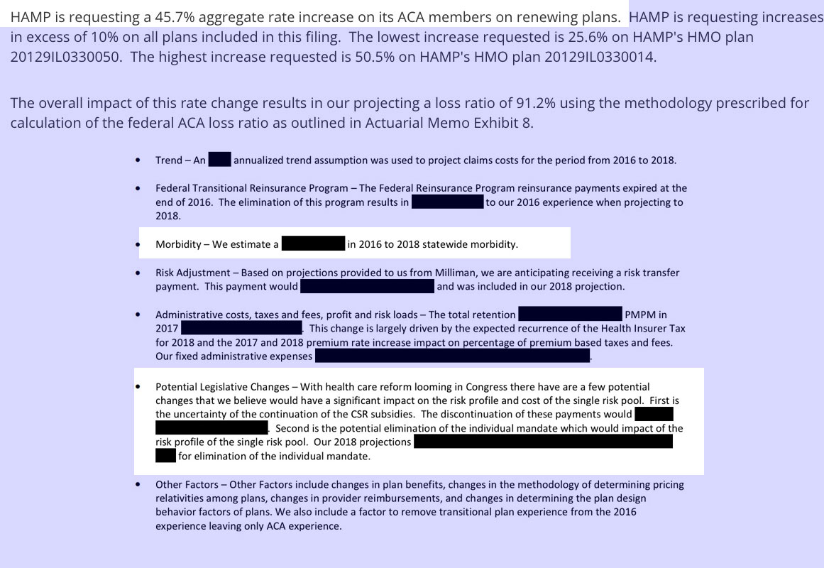 For instance in Illinois, Kaiser estimates that carriers would have to raise rates by 14% on Silver plans to cover their CSR losses. However, only 64% of Illinois exchange enrollees have silver plans to begin with, so I'm only plugging in about 9%. There are 5 carriers operating on the Illinois individual market (well, really 4, since "Freedom Life" doesn't count). I have the hard enrollment numbers for 4 of the 5; for Health Alliance Medical Plans I used 30,000 based on their 2016 number. Overall, Illinois is looking at around 11.3% w/partial sabotage, 20.3% with full sabotage: