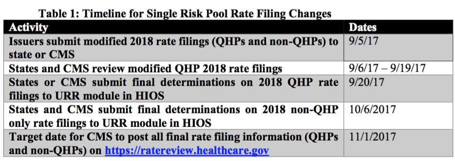 Answer: Yes, in order to provide consistency to such requests, the updated filing deadlines for single risk pool coverage are set forth below. All applicable parts of the Rate Filing Justification should be submitted as outlined in Table 1, including the Unified Rate Review Template (URRT), the Actuarial Memorandum and, if any of the plans have a rate increase of 10 percent or more, the Consumer Justification Narrative. These new timelines do not apply to standalone dental plan (SADP) issuers.