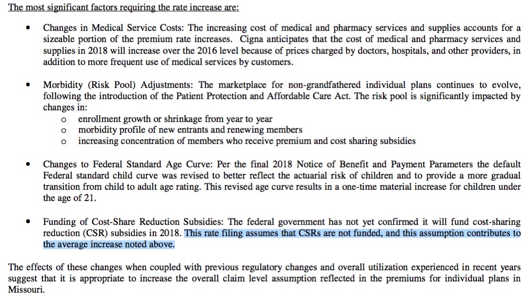 As for the CSR reimbursement issue: Again, only 3 of the carriers would be impacted by this, and one of those (Celtic) is new to the state and therefore has no previous premium average to compare against. This leaves Cigna and Healthy Alliance...both of which explicitly state that their requests assume CSRs will NOT be paid next year. The Kaiser Family Foundation estimates that CSR non-payment will add 18% to Missouri Silver plans, which translates into around 12.2% extra if spread across all policies.