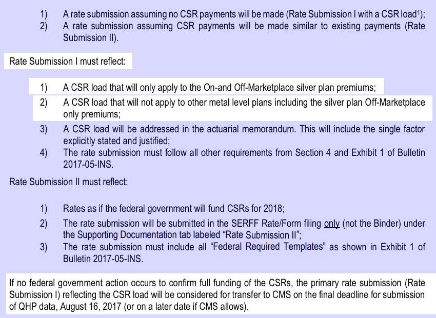 As in most states, the Michigan Dept. of Financial Services, seeing the potential writing on the wall, sent out a memo to all individual market insurance carriers instructing them to submit two different sets of rate filings for 2018: One assuming CSR payments would continue, the other assuming they won't: