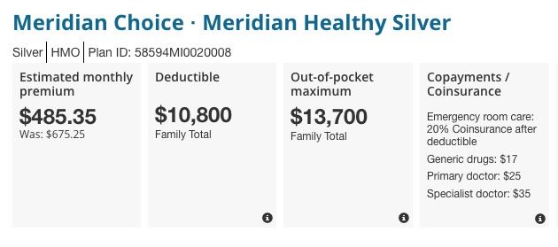 For 2017, that Meridian Choice Silver plan costs them the full $675/month, with the $10,800 deductible: