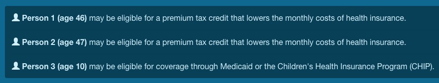 Note, however, that their child would be automatically eligible for the CHIP program (assuming, of course, that Congress actually renews the funding of the program which lapsed nearly a month ago). The private policy for this family would only apply to the two adults: