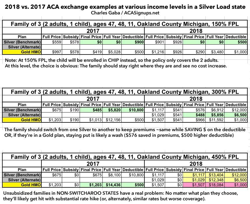 • The 300% income family can save money by switching from one Silver plan to another ($1,092 more in premiums but $4,300 lower deductible).