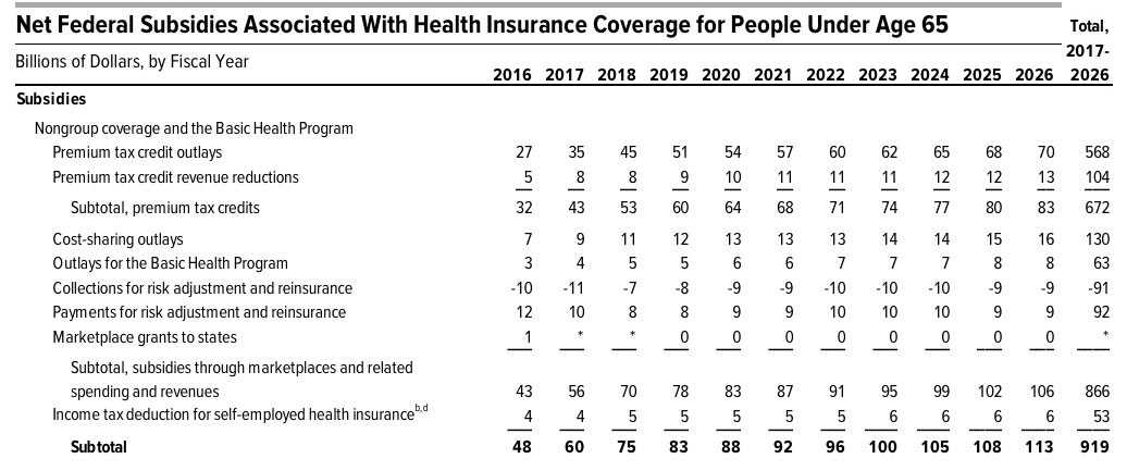 The March 2016 baseline assumes that from 2017 - 2026, the APTC, CSR & BHP programs would cost a net of $919 billion total for an average of 15.2 million subsidized enrollees per year (14.2 million receiving APTC/CSR, plus another 1 million BHP enrollees), or around $6,046 per subsidized enrollee per year on average.