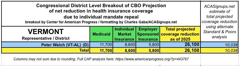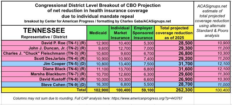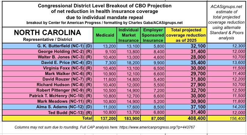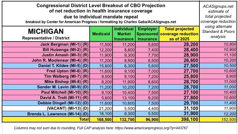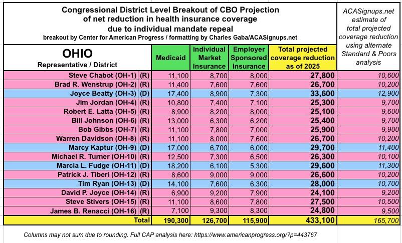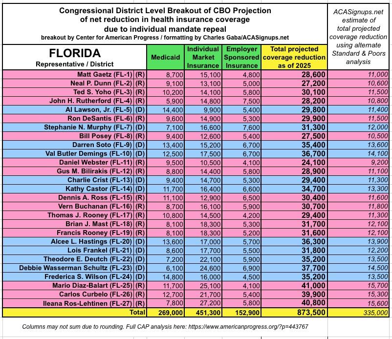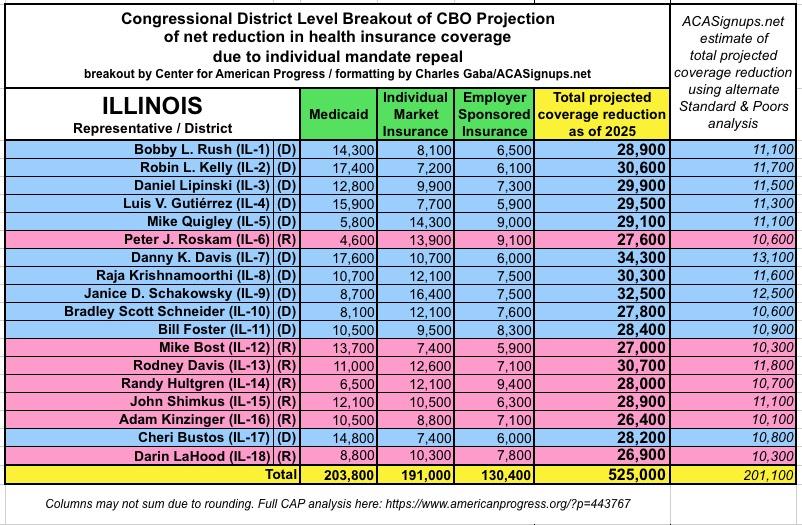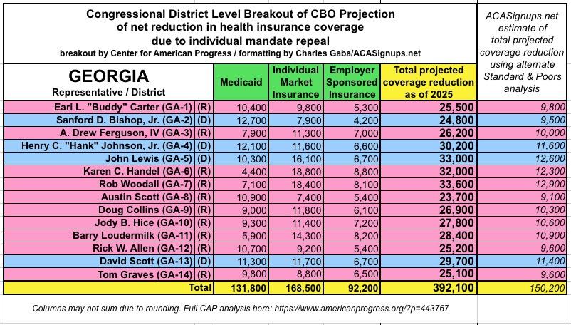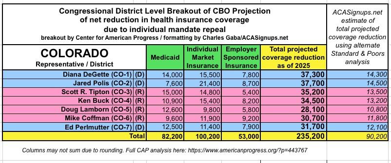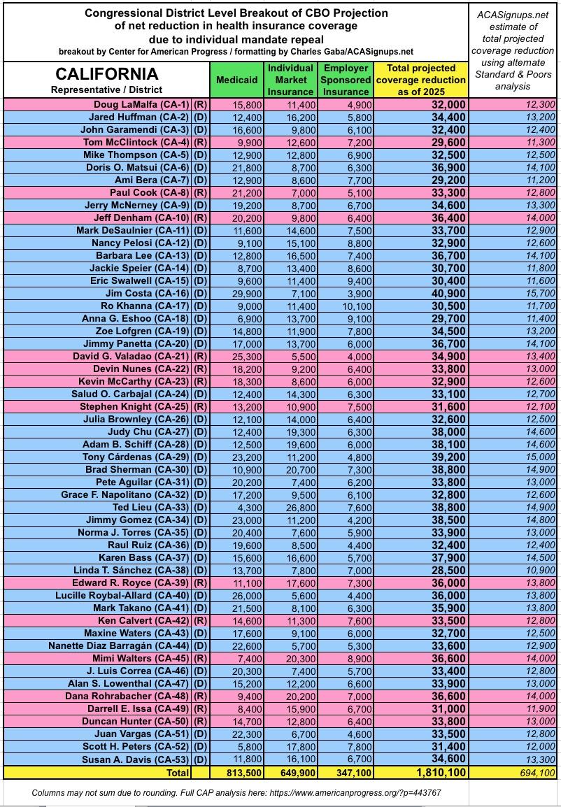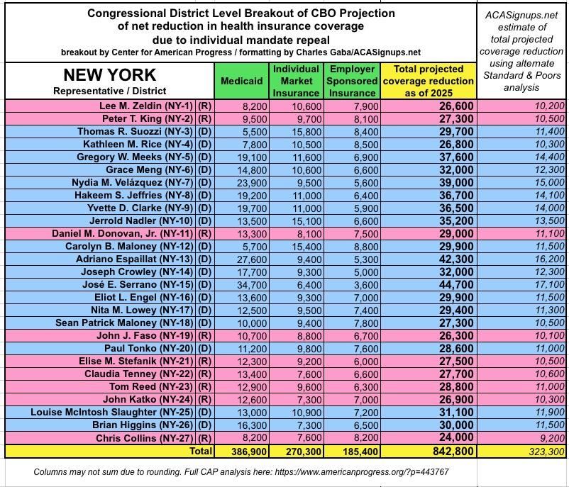 One more thing, however: In addition to the Congressional Budget Office projections, I've also included my own CD-level breakout of the lower coverage loss projections estimated by Standard & Poors. Unlike the CBO's 13 million projection, S&P estimates that only around 5 million people at most would lose coverage over the next several years if the ACA's individual mandate were to be repealed (without other significant changes to the law).