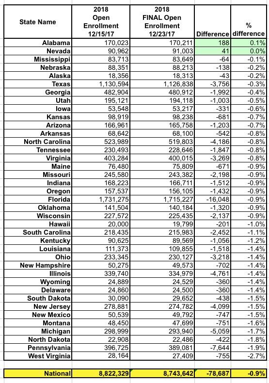 Here's how the final state numbers compare against the semi-total from 12/15...as you can see, two states did still end with slightly higher numbers anyway (Alabama and Nevada). Florida had the largest raw drop (understandable since they have the largest enrollment number to begin with), but West Virginia had the highest drop on a percentage basis, losing 2.7% of the prior subtotal.
