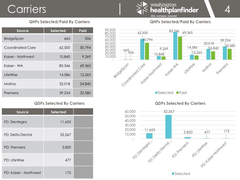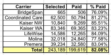 Usually I'm only interested in carrier market share breakouts over the summer/fall since I need this info to calculate weighted rate change averages. However, the table to the top left above is the first time I've seen an apples-to-apples comparison of payment rates between carriers. It looks like Kaiser and LifeWise are pretty good at getting their customers to pay up, but BridgeSpan and Molina, not so much: