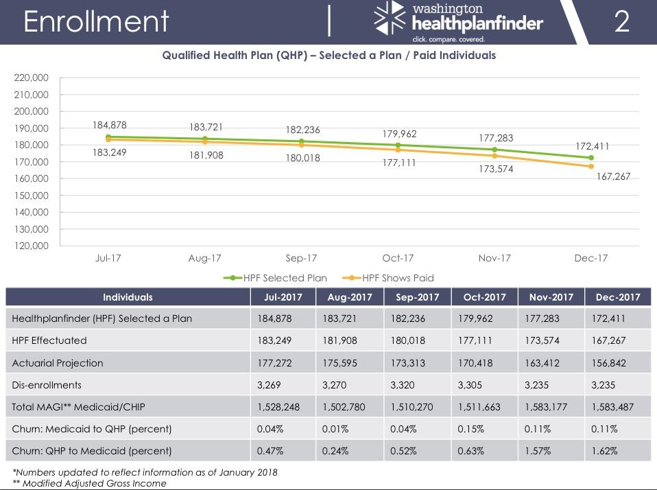 At first glance, the slide above makes it appear that only 81% of 2018 enrollees have paid their first monthly premium. However, it's important to keep in mind that enrollees who signed up after December 15th didn't have their policies go into effect until February 1st; what's relevant here is how many of those who enrolled through 12/15 paid up for January coverage. Washington reported 230,591 QHP selections thru 12/15. I don't know what the breakout of the 198,080 who had paid up as of 1/25 was between Jan and Feb start dates, but this slide suggests that somewhere between 81-86% of January enrollees have paid. This is still lower than the 90% national average rule of thumb I've been using for awhile, however.
