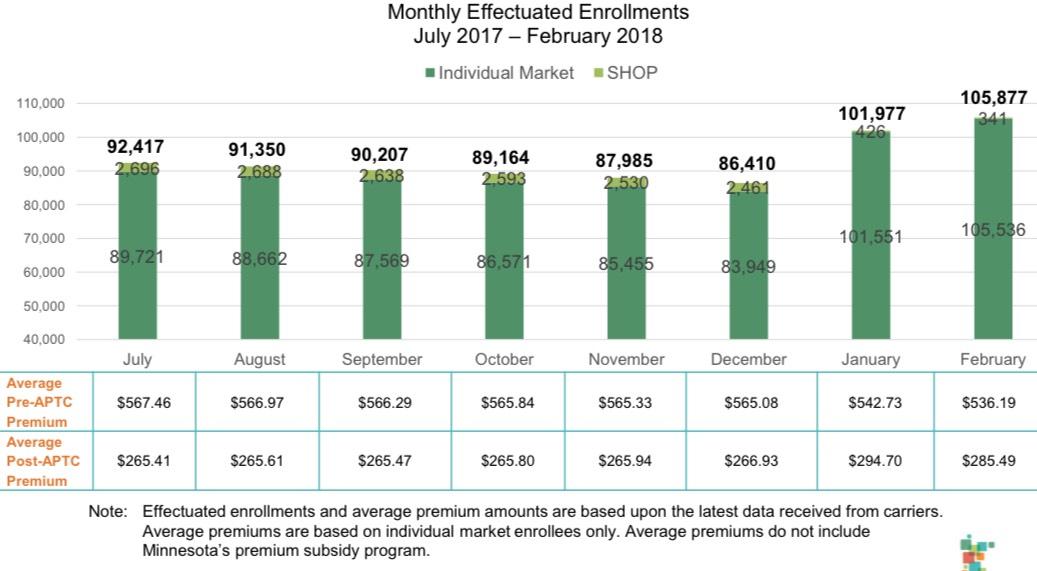 In addition, according to the same report there were 105,536 Minnesotans enrolled in effectuated exchange policies as of February (plus 341 in SHOP plans). That's a 91% retention rate through February, which is right about where I'd expect it to be.