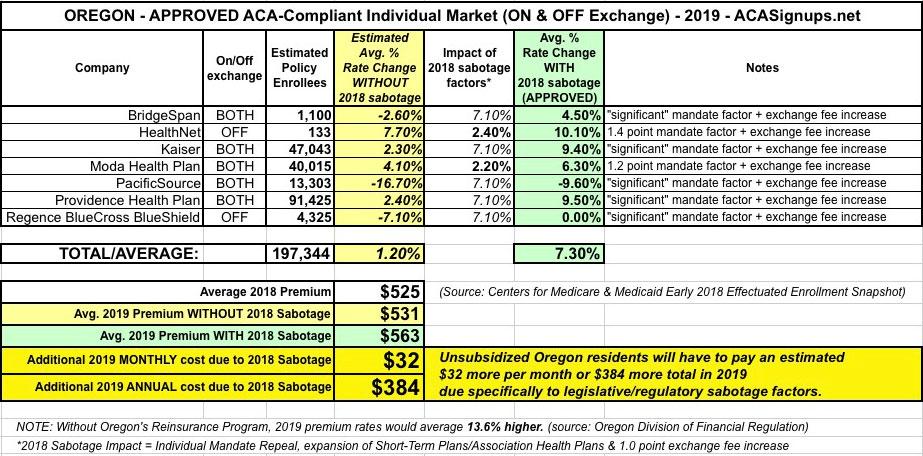 Oregon: FINAL, APPROVED 2019 #ACA premiums: $384 higher for the year due specifically to sabotage