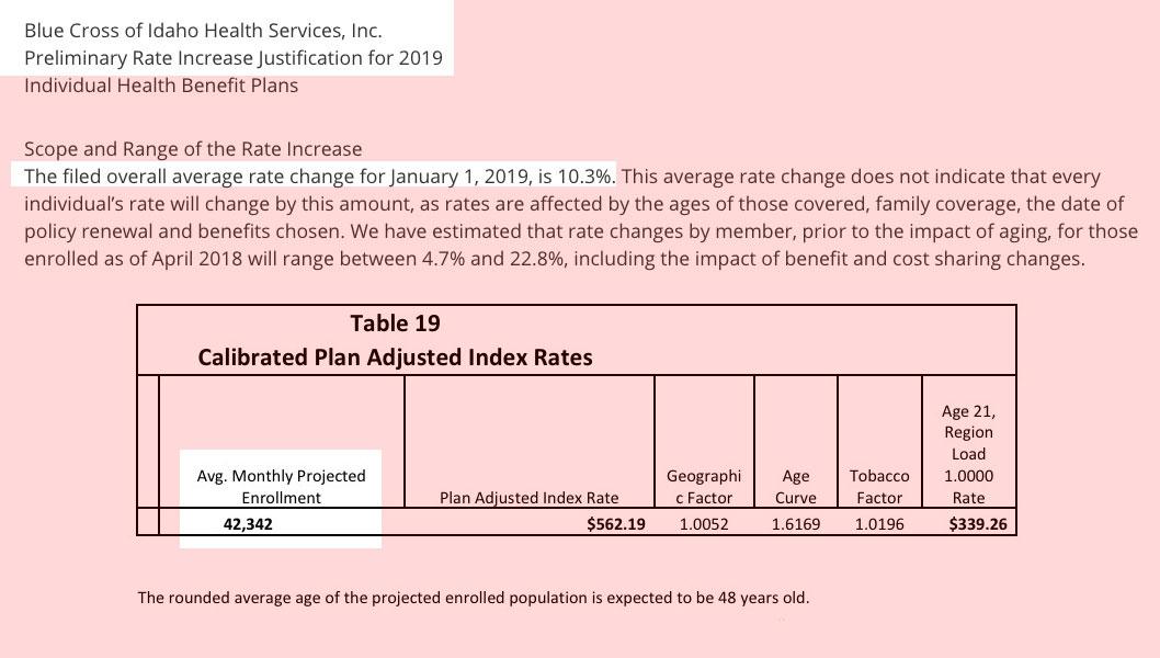 Idaho's insurance department website displays their annual rate filing summaries in a unique way--they don't publish the actual enrollment numbers, but they do post breakouts of the rate hikes for different metal levels (handy!) as well as the premiums brought in and claims paid out, which gives some refreshing insight into just how profitable (or not) some fo the carriers are (if I'm reading the screenshot correctly, it looks to me like BCBS and Mountain Health did just fine last year, but the other three carriers ended up in the hole (especially SelectHealth...ouch).
