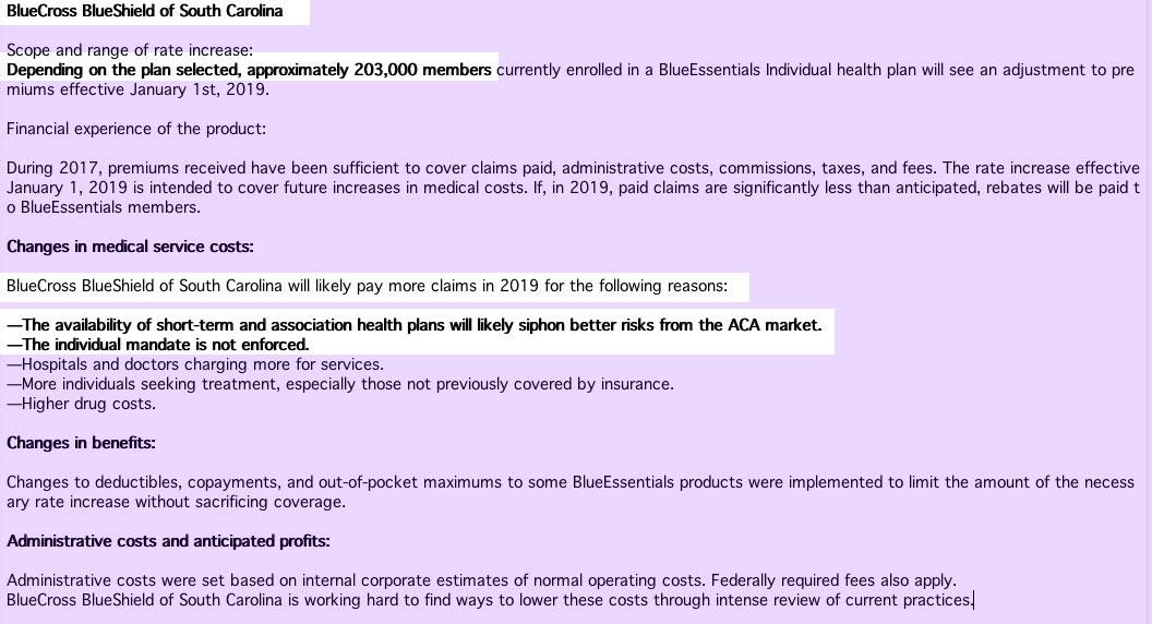 The only confusing thing about South Carolina's 2019 rate filings is that I'm not sure whether the "BlueChoice Health Plan" should be rolled in with the main Blue Cross Blue Shield of SC population. Carriers often have multiple listings in the same state for different policy lines, but they're generally listed under the same official corporate name. In this case, "BlueChoice" (which is clearly still part of BCBS) has a completely seaparate listing.